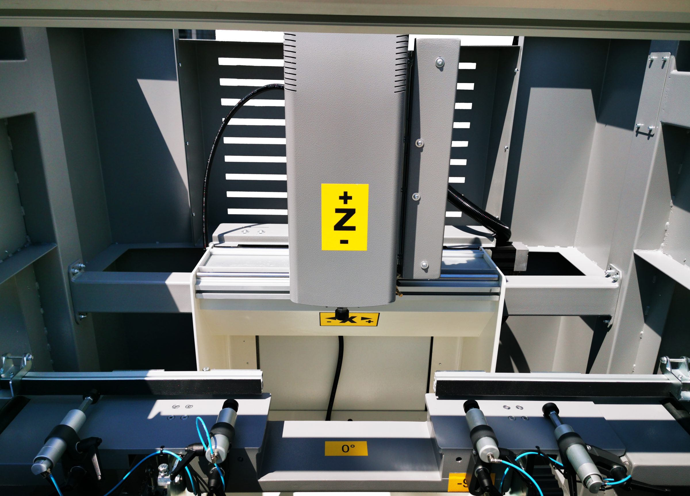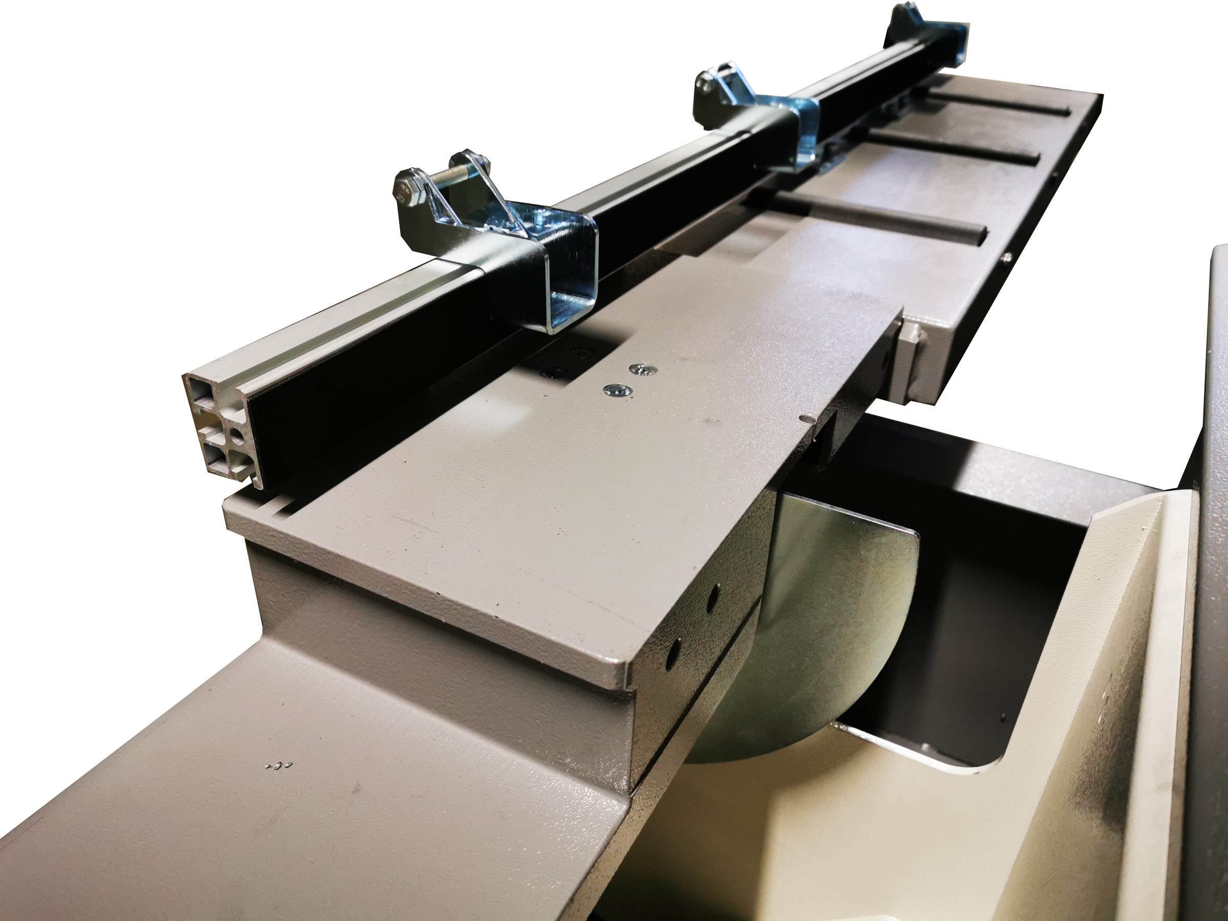 Jedinica dolazi s 4 pneumatske stezaljke za učvršćivanje materijala, lijevim i desnim potpornim stolom od 1 m opremljenim s 3 referentna graničnika svaki. Korekcija promjera alata kompenzirana softverom.