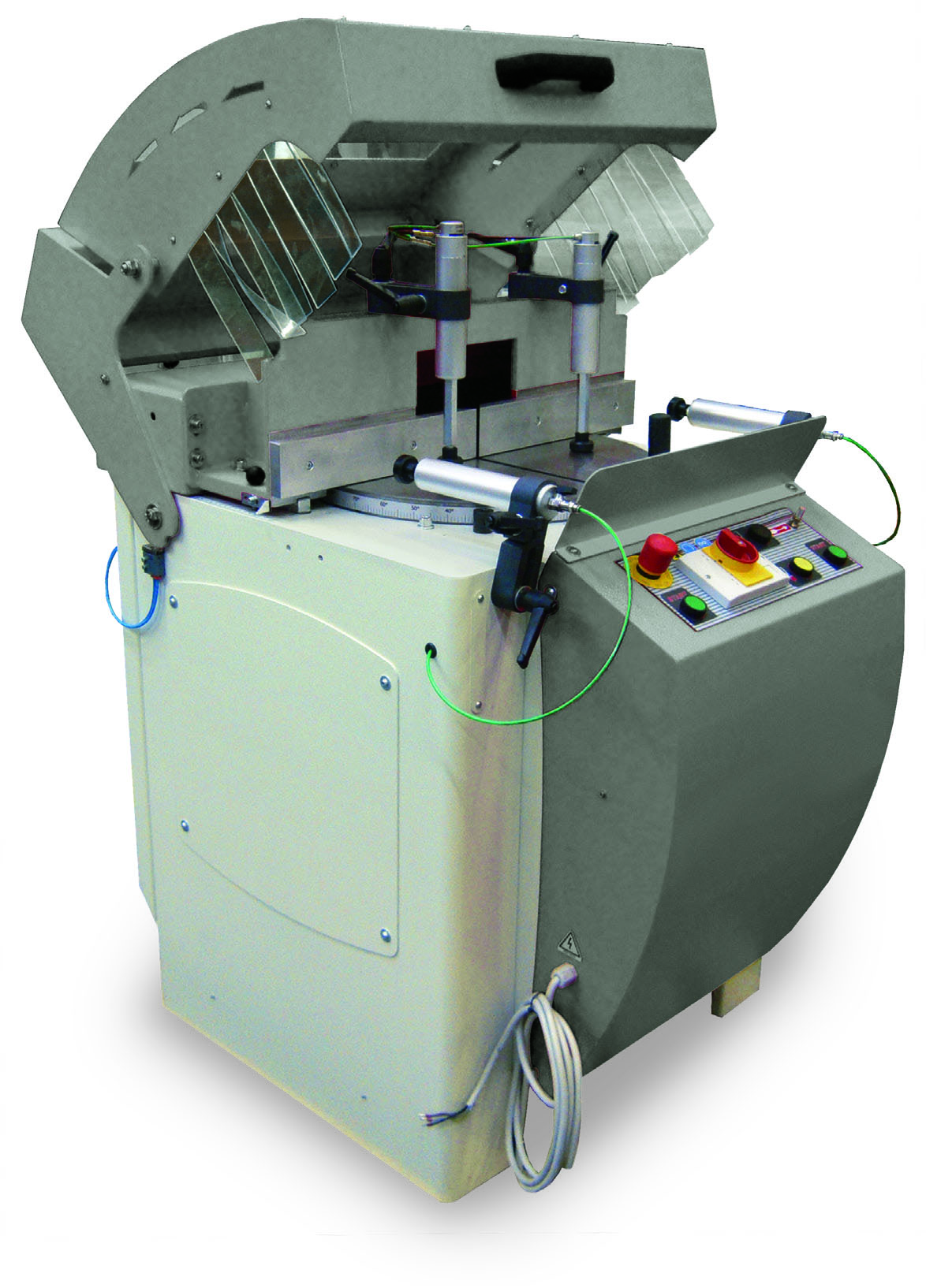 JEDNOGLAVA PILA LUNA 450 Poluautomatski stroj za rezanje aluminijskih i PVC profila, stroj za rezanje s jednom glavom s oštricom koja se podiže prema gore na linearnim ležajevima sa stolom koji se ručno okreće od 90° do 20° desno i 20° lijevo, s mogućnošću međukutova s mehaničkom kočnicom za zaključavanje u traženom položaju, uključeni su i unaprijed postavljeni graničnici za 90°, 45° i 135°. Kompletan s dvoručnim sigurnosnim uređajem protiv ponavljanja i snažnim motorom od 1,5 kW.