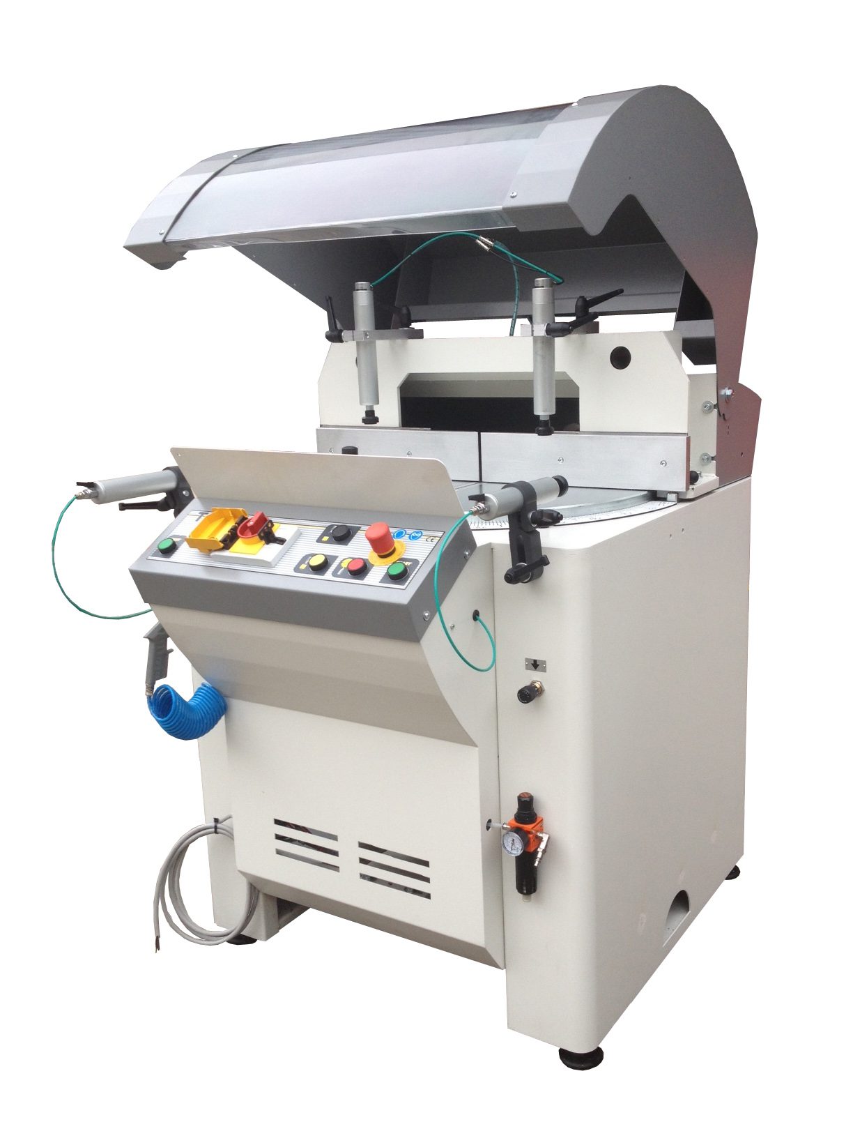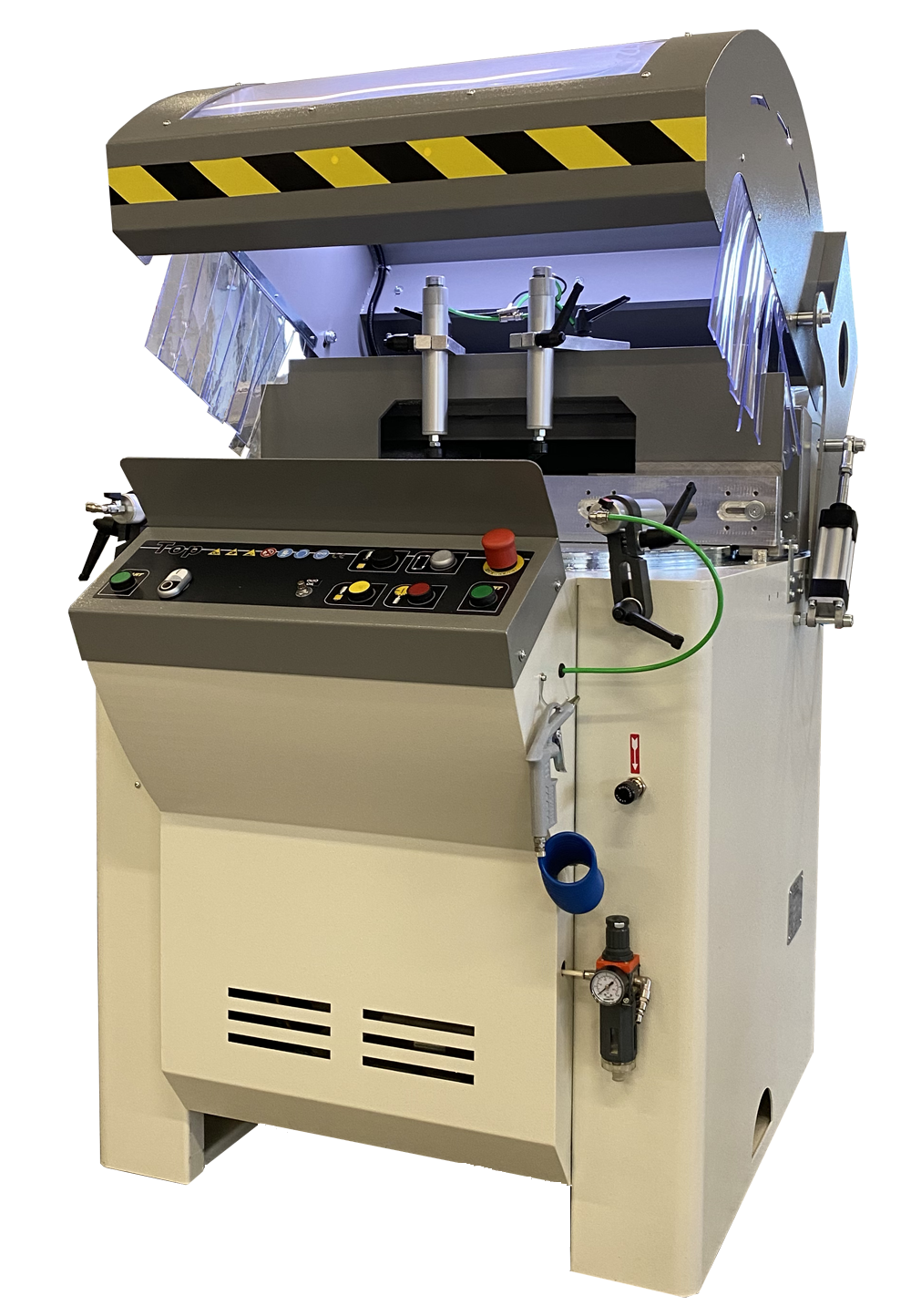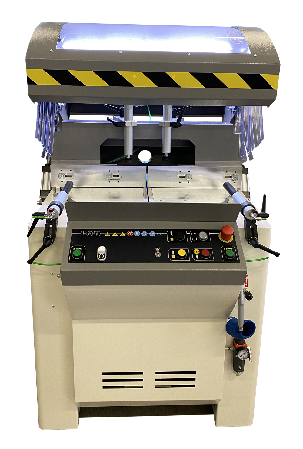 TOP600 Poluautomatska jednoglava pila za rezanje aluminijskih i PVC profila, stroj za rezanje s jednom glavom s oštricom koja se podiže prema gore na linearnim ležajevima i stolom koji se okreće od 90° do 20° desno i 20° lijevo, s mogućnošću međustupnjeva s mehaničkom kočnicom za zaključavanje u traženom položaju, uključeni su i unaprijed postavljeni graničnici za 90°, 45° i 135°. Kompletan s dvoručnim sigurnosnim uređajem i snažnim motorom od 4 kW.